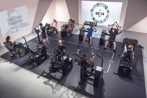 Mehrere Personen trainieren an modernen Fitnessgeräten in einem Fitnessstudio mit digitalen Anzeigen